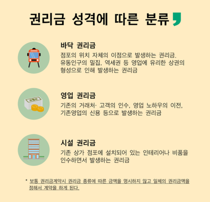 영업 권리금 : 고객 유치와 사업의 평판에 따라 달라지는 권리금입니다. 고객의 방문 빈도와 매출에 큰 영향을 미칩니다.