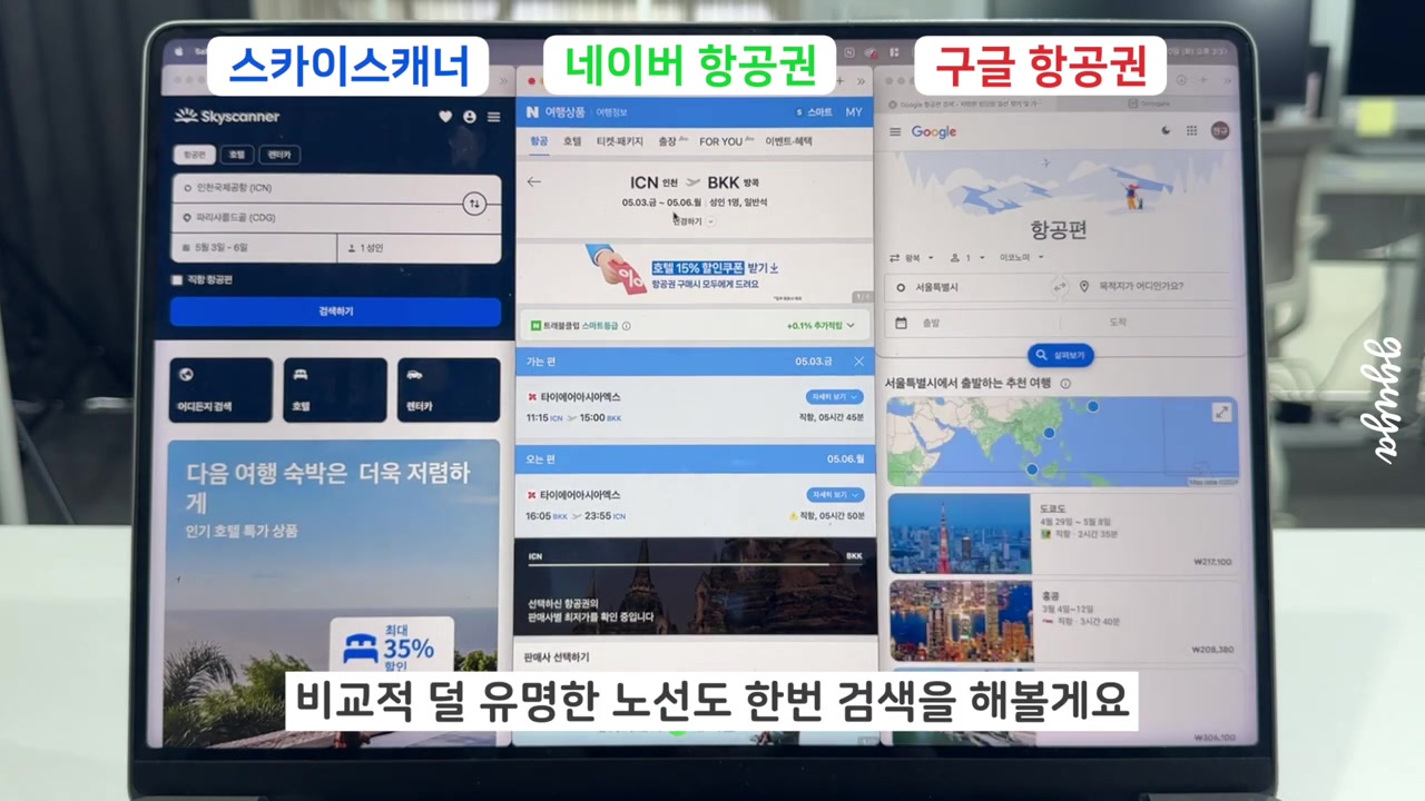 항공권 검색 시스템인 스카이스캐너, 네이버 항공권, 구글 항공권을 동일한 조건으로 비교 분석하여 정보를 제공해요.