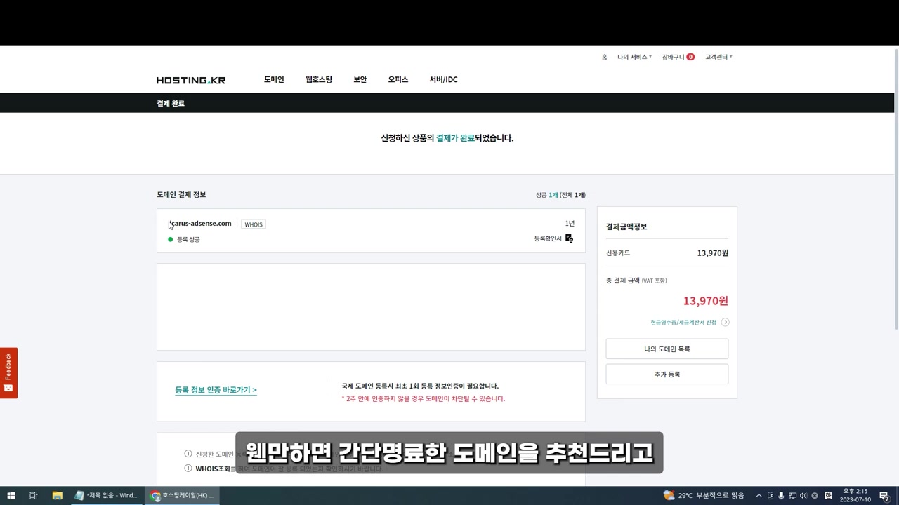 도메인 개인정보 보호는 선택 사항이며, 결제 마치면 도메인을 구매한 것으로 성공해요.