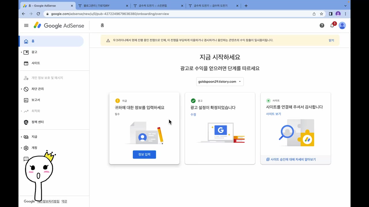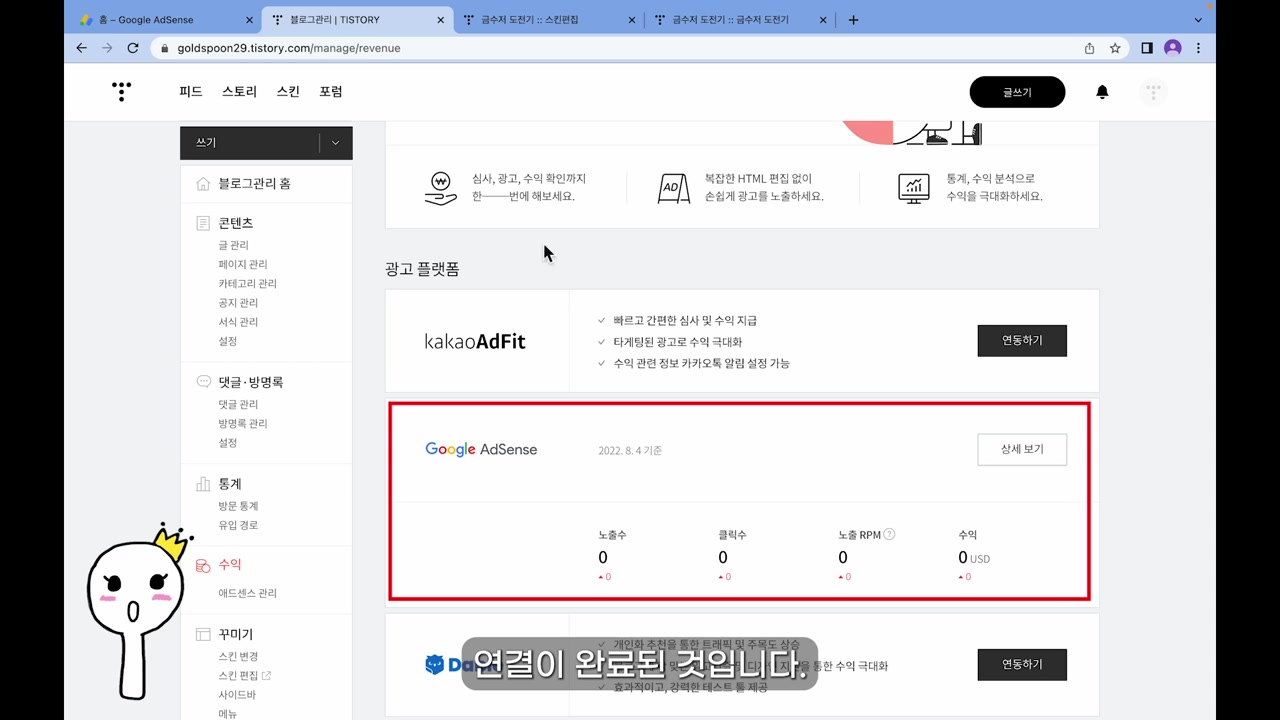 이를 통해 구글 애드센스 연결이 완료되며, 다시 애드센스 화면으로 돌아가면 돼요.
