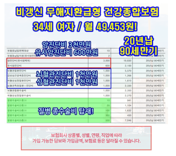 보험료는 나이, 성별, 건강 상태에 따라 달라져요. 예를 들어, 34세 여성의 경우 월 보험료가 약 49,453원이 될 수 있어요.