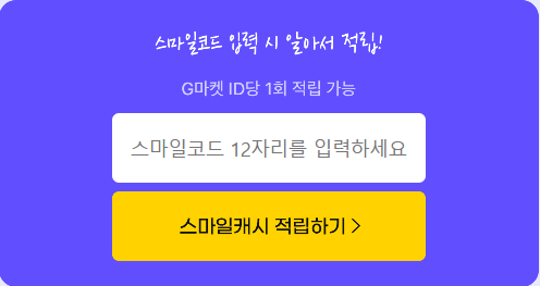 - 이벤트 제휴사로부터 스마일코드를 중복으로 발급받은 경우에도 G마켓 ID당 1회만 스마일캐시 지급이 가능합니다.